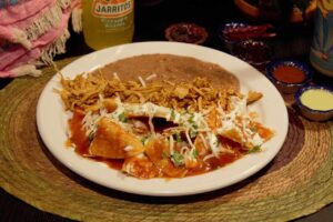 / 4 fried corn tortillas rolled and filled with chicken or pork (your choice), lettuce, tomato, onions, cheese and cream.